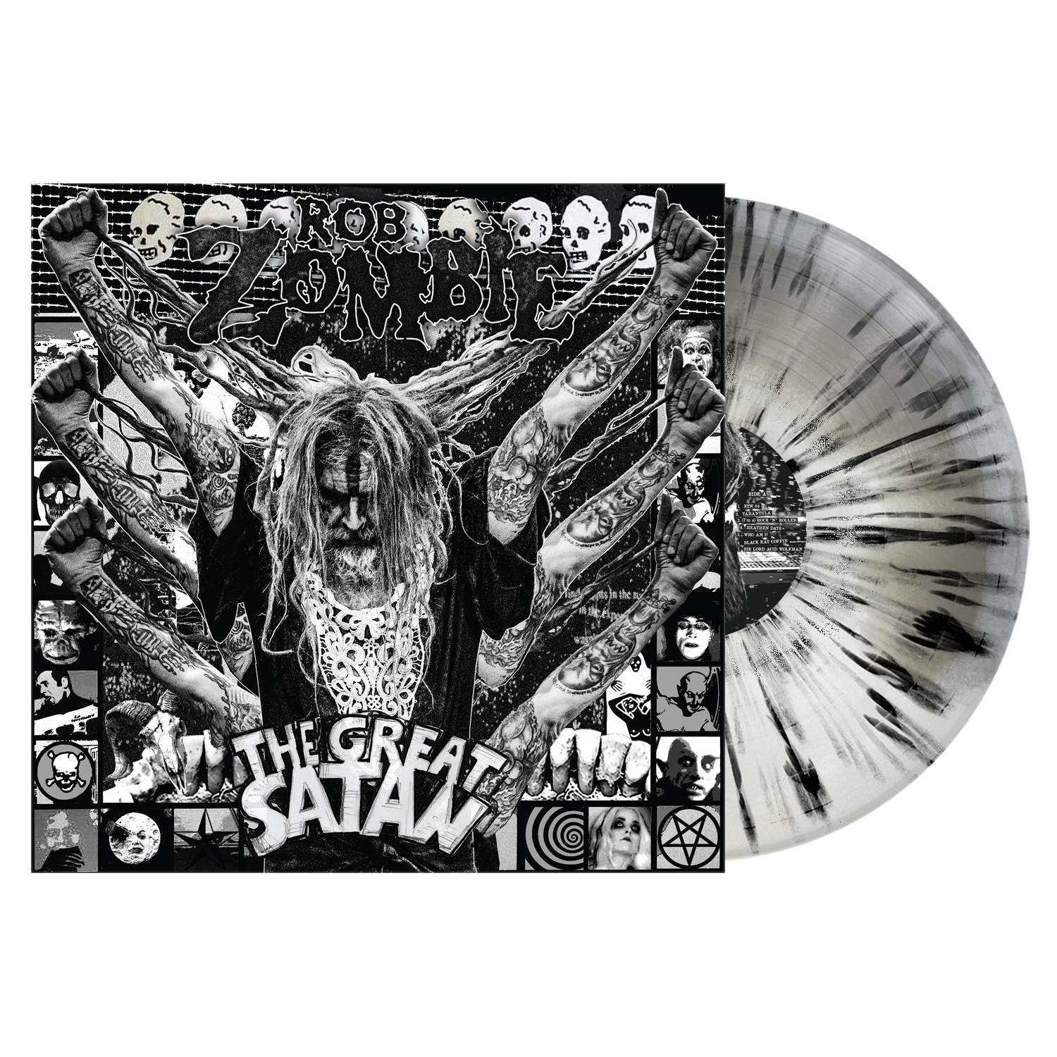 The Great Satan LP on Grey & White Swirl with Black Splatter. 1- LP Gatefold with high quality, oversized 28pg booklet. Exclusive to the Rob Zombie webstore.