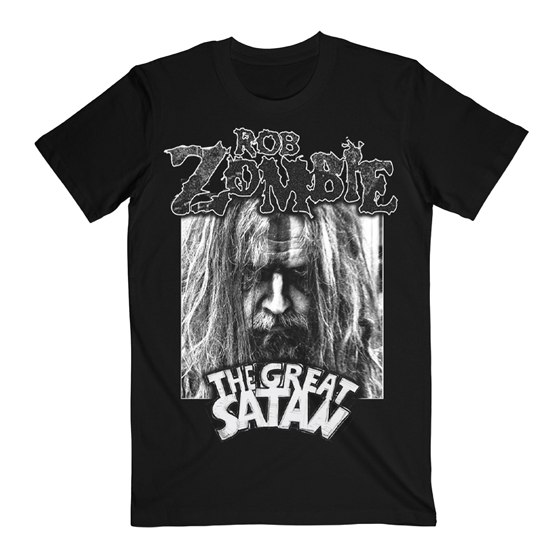 The Great Satan Portrait Tee features a screenprinted design with artwork inspired by Rob Zombie's The Great Satan.