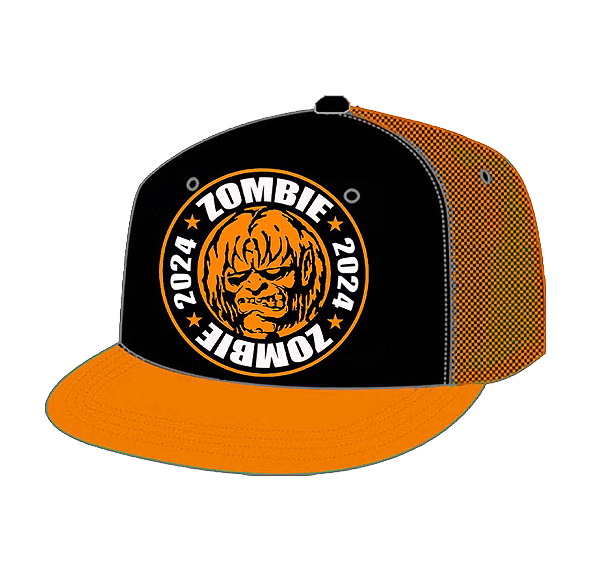 The Zombie Head Trucker Cap features an embroidered front panel with artwork inspired by the Freaks on Parade tour.